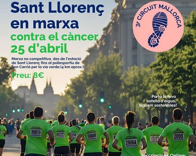 A partir de dia 1 d’abril i fins dia 24 us podeu inscriure a la III MARXA CONTRA EL CÀNCER, una marxa solidària i de caràcter no competitiu, obert a tots els públics, que va des de l’estació de Sant Llorenç fins al poliesportiu de Son Carrió per sa via verda. On em puc inscriure, presencialment a Ca s’Escaleta, a les delegacions de Sa Coma i Son Carrió de les 8.00h. fins a les 14:00h. Em puc inscriure online? Sí, a través del codi QR que hi ha a la cartelleria. 25 d'abril de 2026.
